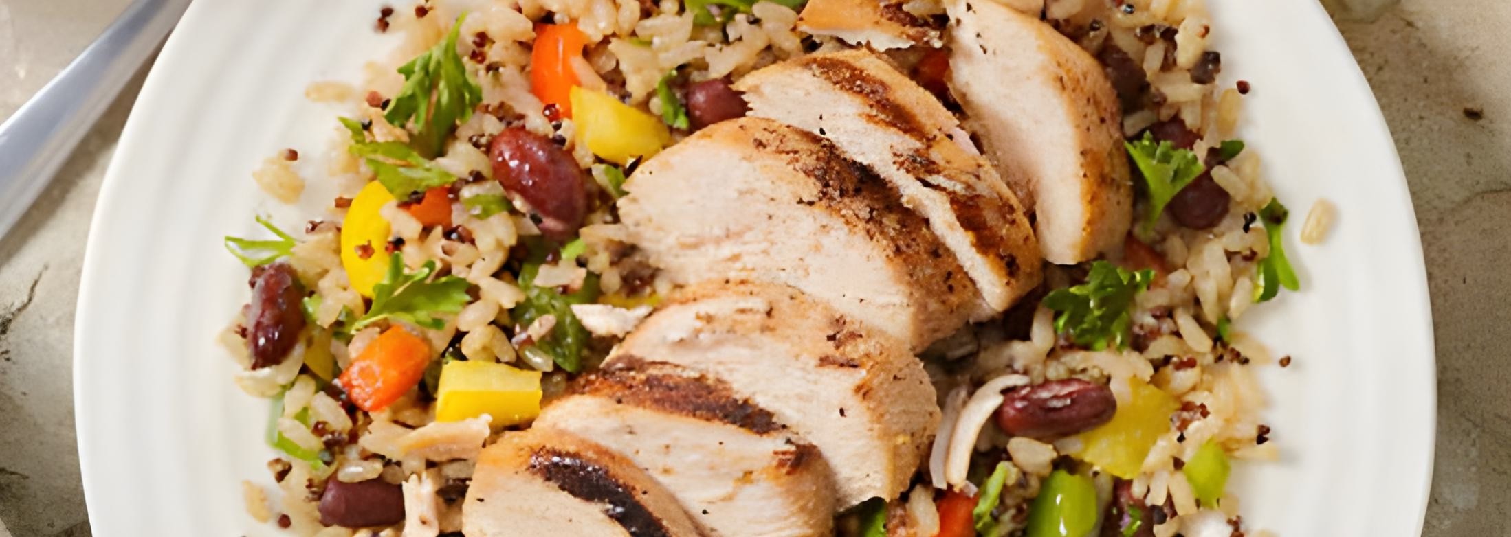 5. Adaugă orezul fiert peste pui și legume și amestecă bine încă 2 minute.